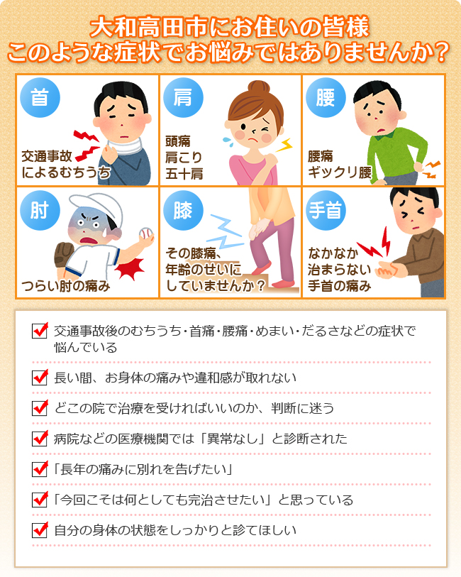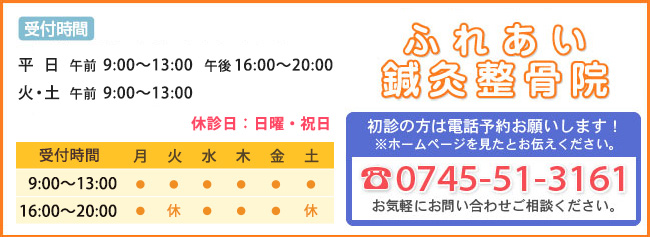 心当たりのある方はぜひ一度大和高田市のふれあい鍼灸整骨院までご相談ください。