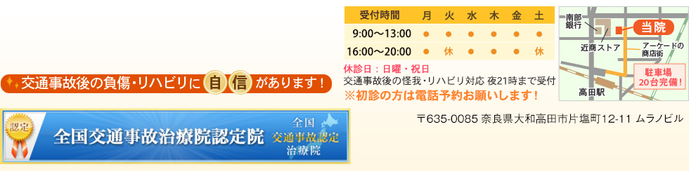 交通事故による症状はただちに施術を必要とすることも多く、大和高田市のふれあい鍼灸整骨院では交通事故によるお客さんは平日夜22時まで受付をしています。