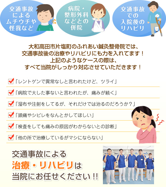 大和高田市のふれあい鍼灸整骨院は数多くの交通事故によるお客さんの施術経験を持ち、病院や整形との併院や入院後のリハビリとしても数多くのお客さんに利用いただいております。